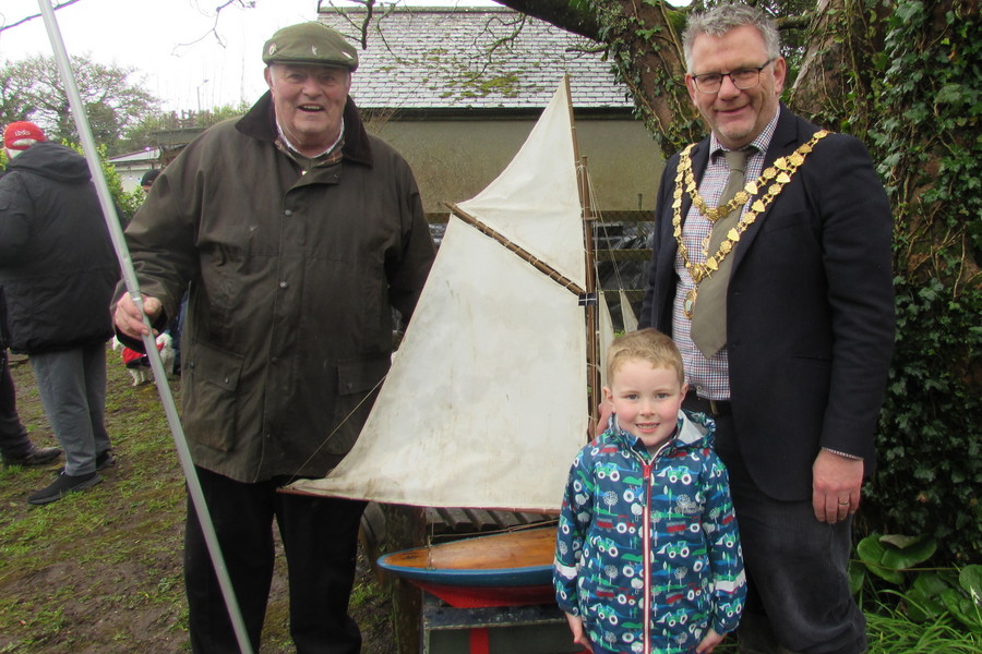 Mayor Johnnie Wells with Denis Preece (left) and Thomas Gwyn Preece and a boat discovered recently by Thomas’s father, Shaun, at an auction