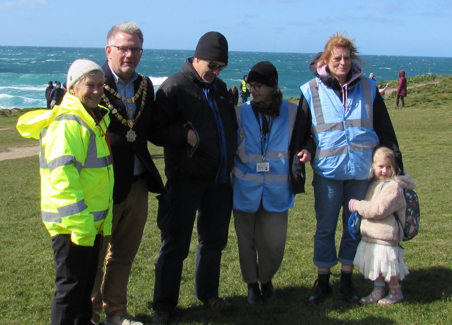 Outlook, blustery: left to right are NCI trustee Helen Simpson, St Ives mayor Johnnie Wells, Billy ‘Dr Kite’ Wynter, the library’s Sam Atkins, and artist Laura Peach